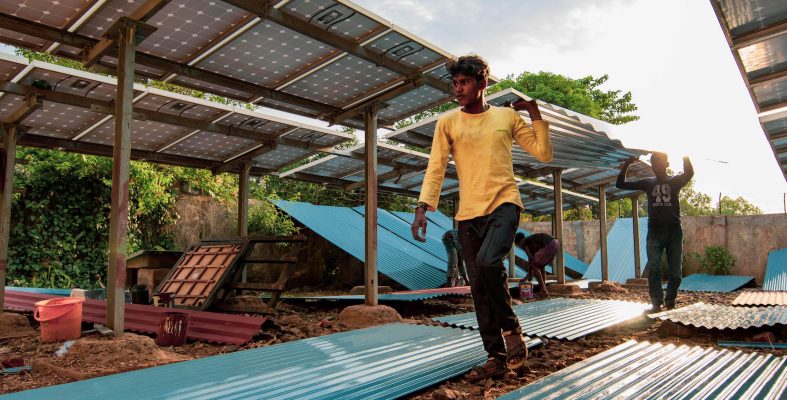 A drone shot of the solar powerhouse under construction. Newly painted roofing sheets dry among the solar panels. Photo credit: Ajaya Behera.