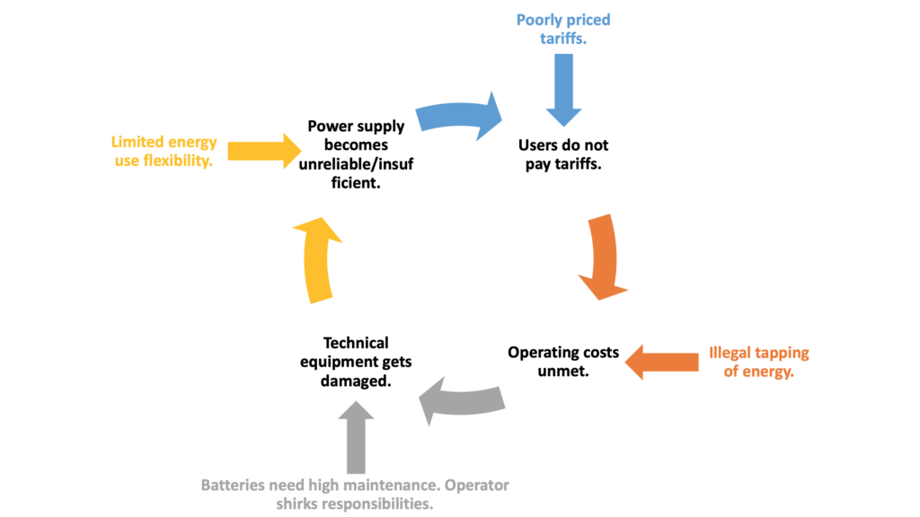 The system quickly fell into what Schnitzer et al. call a “vicious cycle” in their report Micro-grids for Rural Electrification: A critical review of best practices based on seven case studies. What happened in Maligaon is better illustrated by a vicious ‘pin-wheel’ where forces at each curl accelerated the vicious cycle.