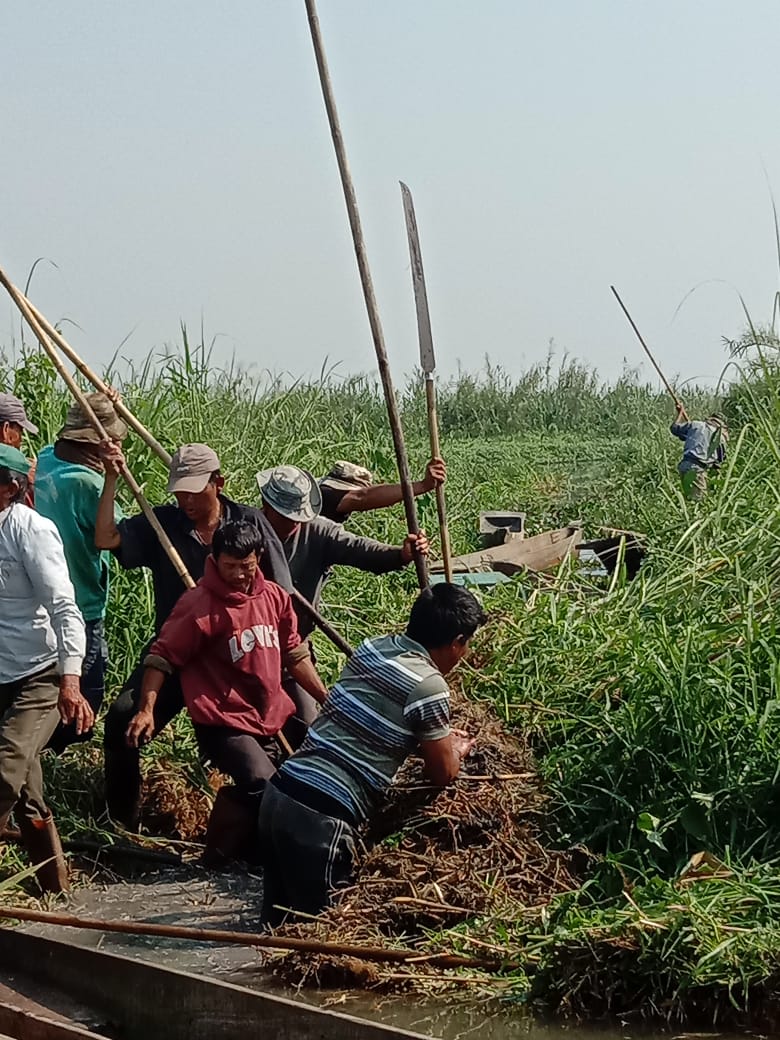 ALLAFUM volunteers clearing up weeds chocking passageway of Yangoi Maril (Nambul River) at the point where the river flows into Loktak Lake, 2020. Photo: Oinam Deben