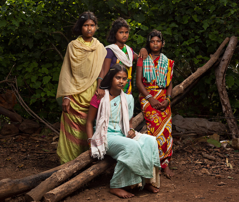 Eighteen-year-old Laxmi Kadraka, seated, poses with her friends in Rodango village in Niyamgiri. Image by Indrajeet Rajkhowa.
