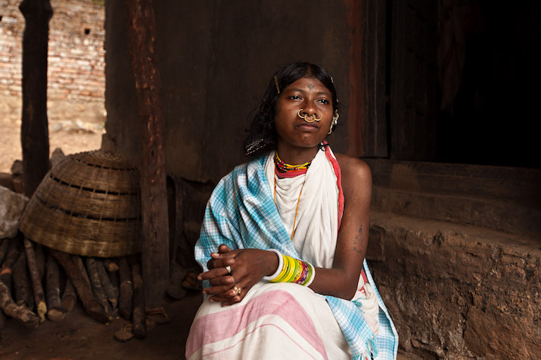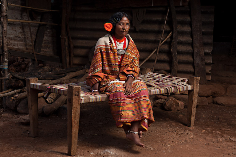 Thirty-year-old Gatri Kadraka sits outside her house in Rodango village in traditional Dongria attire. Image by Indrajeet Rajkhowa.