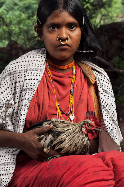 A Dongria girl holds a chicken in Hundijali village. Chickens are often used as barter during seed exchanges between different Dongria communities. Image by Indrajeet Rajkhowa.
