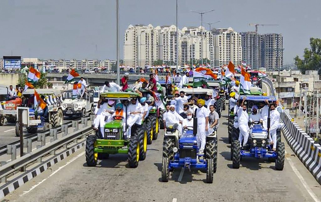 Farmers on tractors during ‘Kisan Aakrosh Rally’ from Chandigarh organized by Punjab Youth Congress over the farm Bills, in New Delhi, September 20, 2020. Photo: PTI