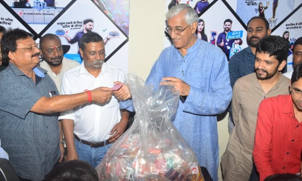 Chhattisgarh health minister, TS Singh Deo, right, brought half a kilo of plastic to the launch of the Garbage Cafe to emphasise that the scheme was for everyone. Photograph: Amrit Dhillon