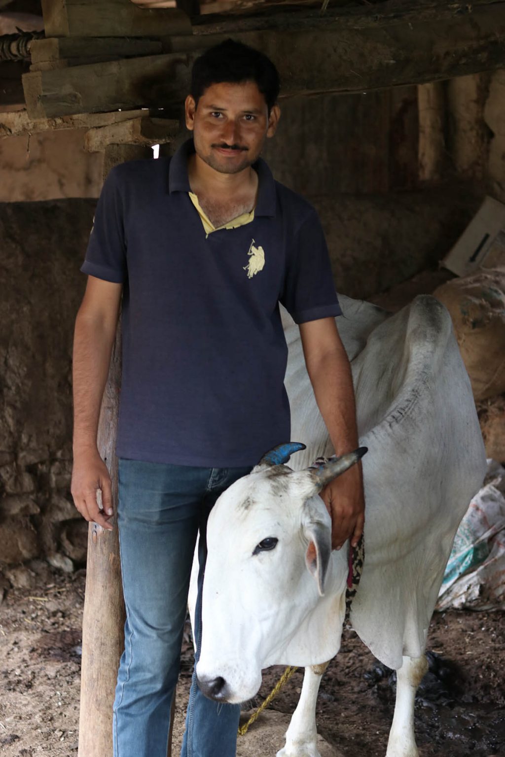 Prafulla with a beautiful and sacred Gaolao cow, the pride of the Nanda-Gaoli community. Photo: Nipun Prabhakar, 2019