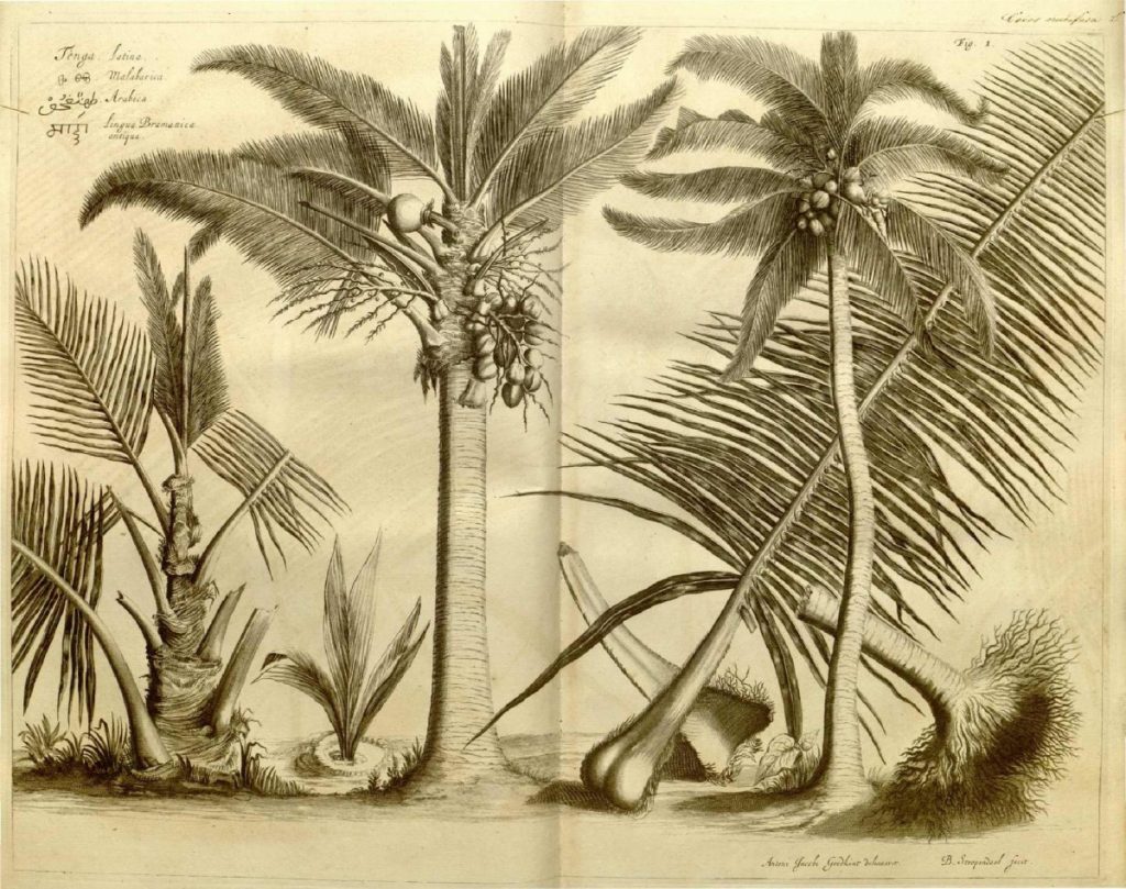 An illustration of the coconut tree from Hortus Malabaricus, with names in Latin, Malayalam, Arabic and Konkani written in the Nagari script. Credit: K.S. Manilal