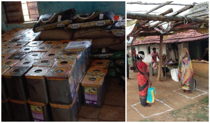 (L)Tins of cooking oil and rice stored in Kukdale before being distributed. (R) residents line up to collect items while maintaining social distancing in the village of Salhe | Photographs courtesy of Siaram Halami