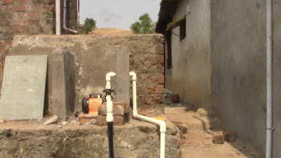 The campus has a hand pump in which there is inserted a two phase submersible pump of one horsepower (HP). Initially after the toilets and bathrooms were constructed they were fitted with two numbers of one thousand litre tanks in addition to the one thousand litre tank that was already there for the three toilets built earlier. These tanks were connected to the submersible pump. However, this total of three thousand litres of water supply proved totally inadequate for servicing fifteen bathrooms and eighteen toilets. The tanks would empty out within a few minutes during the morning hours of heavy use and then filling them up again and again was a big problem. Later during the day the tanks would remain empty and so the children would have to cart water in buckets from the handpump to the toilets over a distance of over a hundred metres which is a labourious exercise. Given this water shortage the toilets began to stink badly and became a potential health hazard. Moreover, the three septic tanks for treating the sewage were also improperly designed and the outflow from them was collecting near the tanks and creating a stinking pool of dirty water that was contaminating both surface and ground water. One of the septic tanks had even cracked due to improper design and construction that left one of the brick walls of the tank exposed without a retaining support, as a result of an inadequate understanding of the topography and soil quality of the area on the part of the mason who constructed it, adding to the problems.